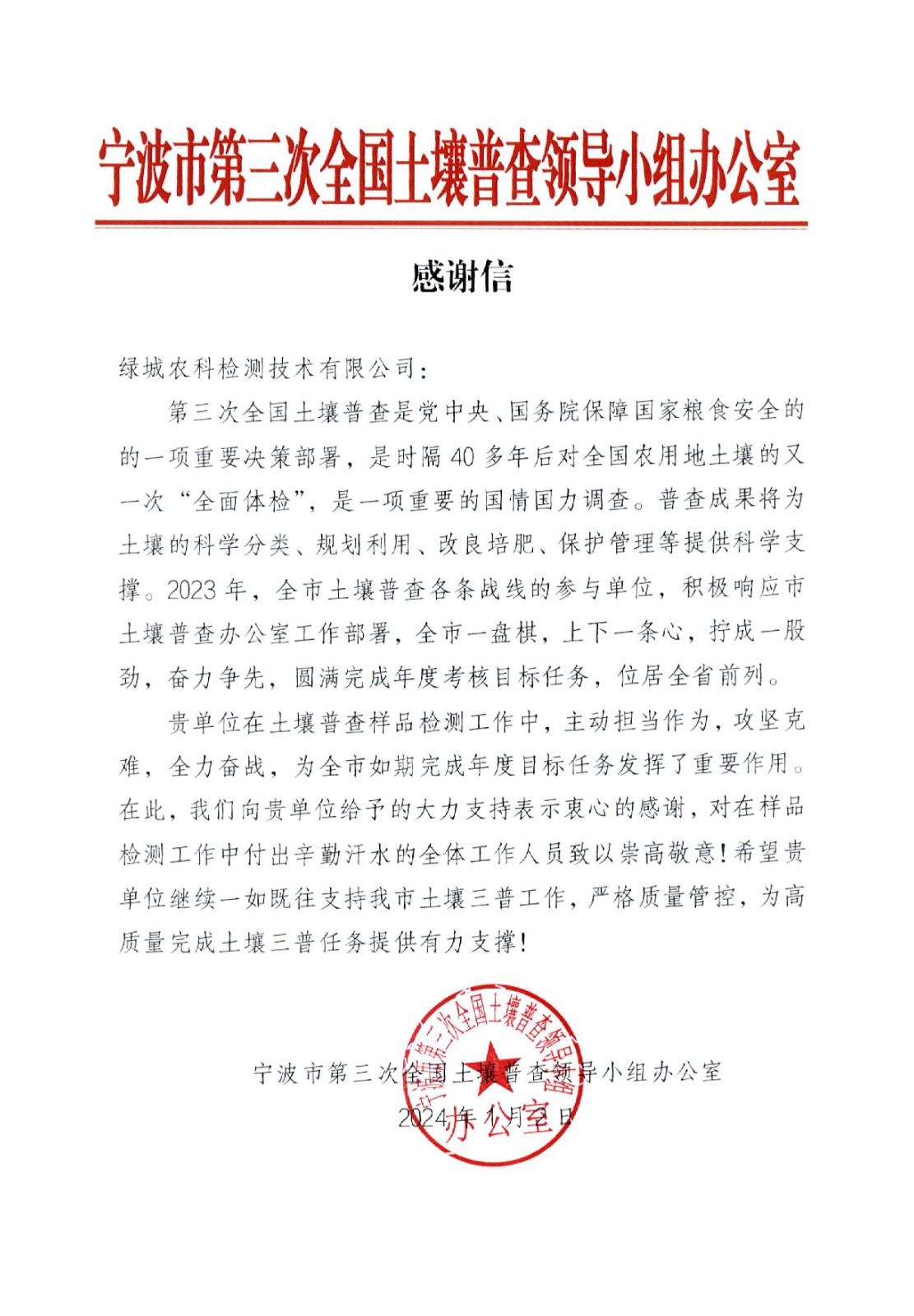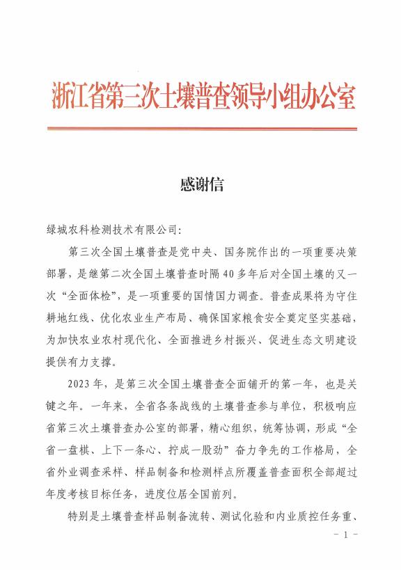 一元复始,,,,,,,万象更新。。。。。。2024年的第一个事情日,,,,,,,绿城农科检测手艺有限公司(以下简称“公司”)惊喜收到浙江省第三次土壤普查向导小组办公室发来的谢谢信,,,,,,,公司上下欣喜之余又倍受鼓舞。。。。。。